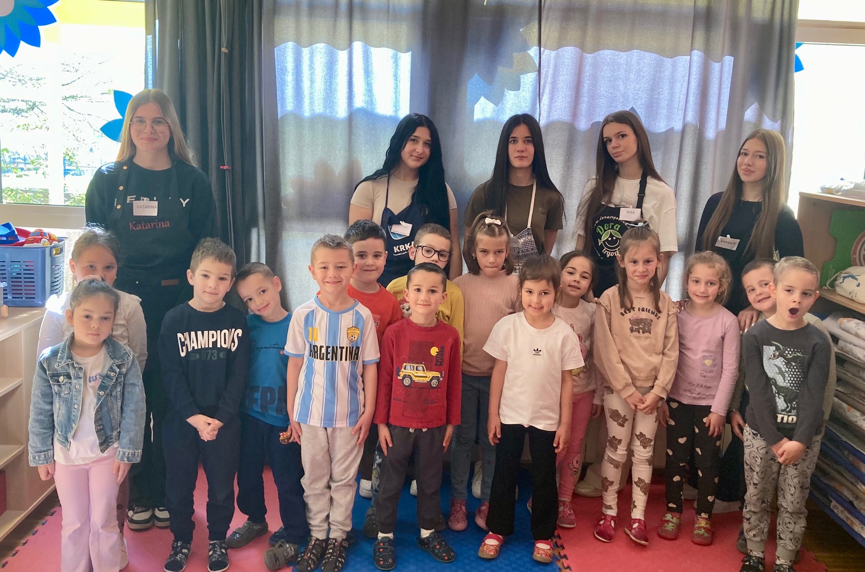 U sklopu projekta Traveša.hr, učenice prvog razreda Srednje škole Ivana Meštrovića Drniš, smjera Referent za poslovnu ekonomiju — Ana Paklar, Anita Kulušić, Tina Strunje, Marija Baran i Lana Čulina — uz mentorstvo profesorice Martine Jerković, posjetile su Dječji vrtić Drniš i predškolsku skupinu Leptiriće gdje ih je ugostila odgajateljica Renata Gaurina.